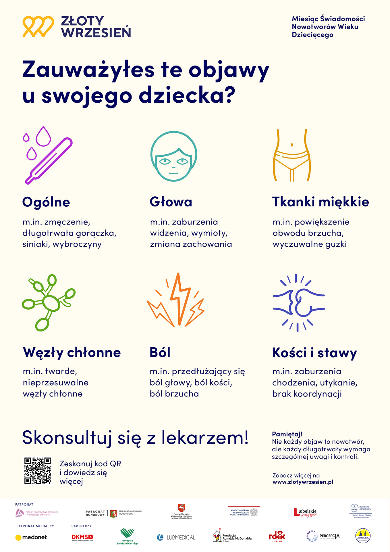 Wrzesień to miesiąc świadomości chorób nowotworowych wieku dziecięcego. Najlepszą pomocą, jaką mogą Państwo dać swojemu dziecku, jest czujność – to właśnie dzięki niej można rozpoznać niepokojące sygnały na czas.